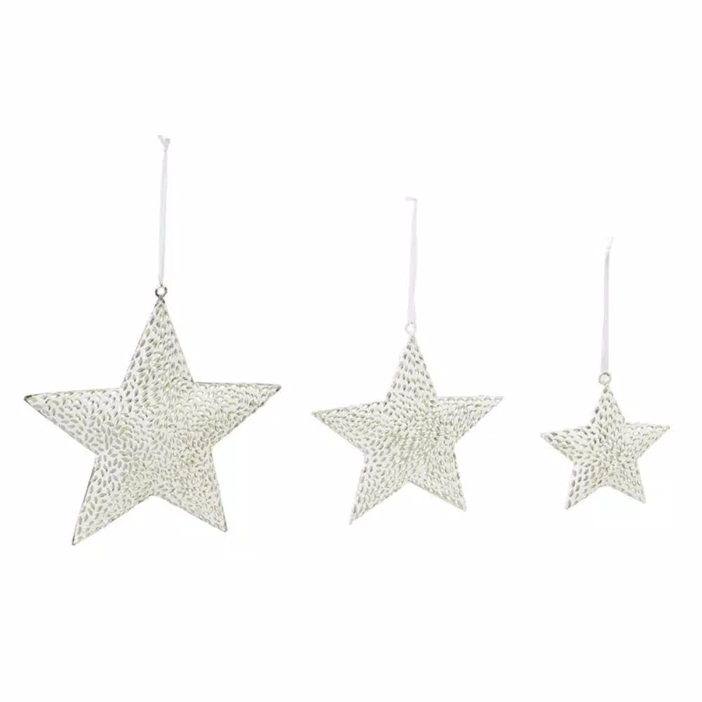Assortment of 3: these metal cut-out Christmas ornaments are shaped like 3 different size stars. The stars are white and have a texture. Each has a cord for easy hanging.