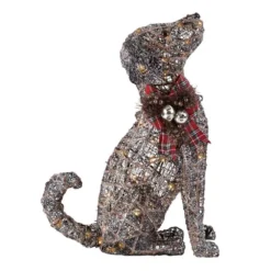 This sitting dog sculpture features 80 LED lights to give your holiday display a charming glow. Standing at 30.5 in. tall, this easy-to-assemble figure will highlight your Christmas decorating. It is crafted from a durable metal frame and weather-resistant fabric with long-lasting LED bulbs. The dog includes ground stakes and extra bulbs and fuses. Place him in indoor or outdoor settings to enhance your scene.