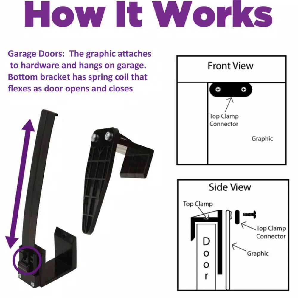 Christmas Garage Door Banner Mural Sign Decor 7 ft. x 16 ft. Car Garage, The Original Holiday Garage Door Banner Decor by My Door Decor, makers of My Door Decor. Proprietary components for easy assembly, allowing door to open and close without hurting the integrity of the door. Huge selection of holiday themes at My Door Decor. Garage Door Decor is manufactured to fit roll-up (sectional) paneled garage doors, as well as canopy (flat) garage doors. We’ve developed a system that makes installation quick and easy. This system requires no tape or screws, which could potentially damage your garage door. Instead, our hardware consists of a hook attachment that goes over the top of the garage door and a tension hook at the bottom. The top hook attachment protects your mural from theft by keeping it securely held behind the frame of the garage door. The tension hook keeps the mural taut when the garage door is closed and protects it from wind damage by flexing with the mural. Each garage door banner is ready to hang with minimal assembly. 2-people installing a single mural should take about 10-minutes. Every banner, whether it’s for your front door or garage door, comes with assembly hardware so it can be installed right out of the box.