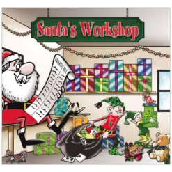 Santa’s Workshop- Celebrate the Holiday with this 2-Car Split Garage Door Decor – Celebrate our country’s birthday with this Holiday graphic. This Garage Door Decor is a colorful and eye catching way to show your Holiday Spirit. Fits Standard 7 ft. x 8 ft. Garage Doors. Flat or Paneled Garage Doors. Garage Door Decor is a Holiday Decoration that you hang on your garage door in a matter of just a few minutes. The Garage Door Decor makes it appear to people passing by that the garage door is open and you have a fun Holiday scene in your garage. My Door Decor created and manufactures the Garage Door Decor and there is nothing else that compares to the Garage Door Decor in Quality, Designs and Pricing. Garage Door Decor is designed to work on standard roll up doors and flat doors. All Garage Door Decors are made of the highest quality materials and construction for many, many years of enjoyment. The Garage Door Decor comes to you fully assembled in a reusable storage box and ready to hang on your door. The hardware we have developed allows you to hang the Garage Door Decor in a matter of just a few minutes and you are able to use your garage door as you normally would. There is nothing attached directly to the door (tapes, screws, etc.).