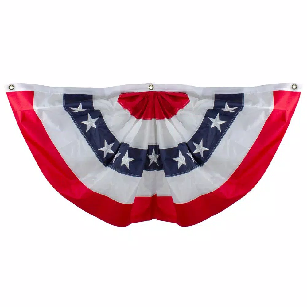 Celebrate your patriotism this summer with our traditional American bunting flag. It comes with beautifully embroidered stars and double-stitched stripes. Perfect for displaying along your porch or inside your home for the 4th of July or Memorial-day. Features: Features red white and blue stripes with white embroidered stars. Fully hemmed edges. Double stitched stripes. A soft high-quality fabric for durability. Constructed with 3 brass grommets for easy hanging. Design is on both sides. Care instructions: Hand wash in cold water with mild soap. Hang dry. Use cool iron if needed. Dimensions: 48 in. W x 24 in. L. Material(s): polyester.