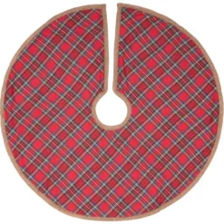 Invite a lodge look into your Christmas morning memories with the soft cotton and felt Gavin Mini Tree Skirt. The skirt is a classic cherry red-base tartan plaid with accents of royal blue, black, forest green, and buttercream. Reverses to camel brown herringbone felt.