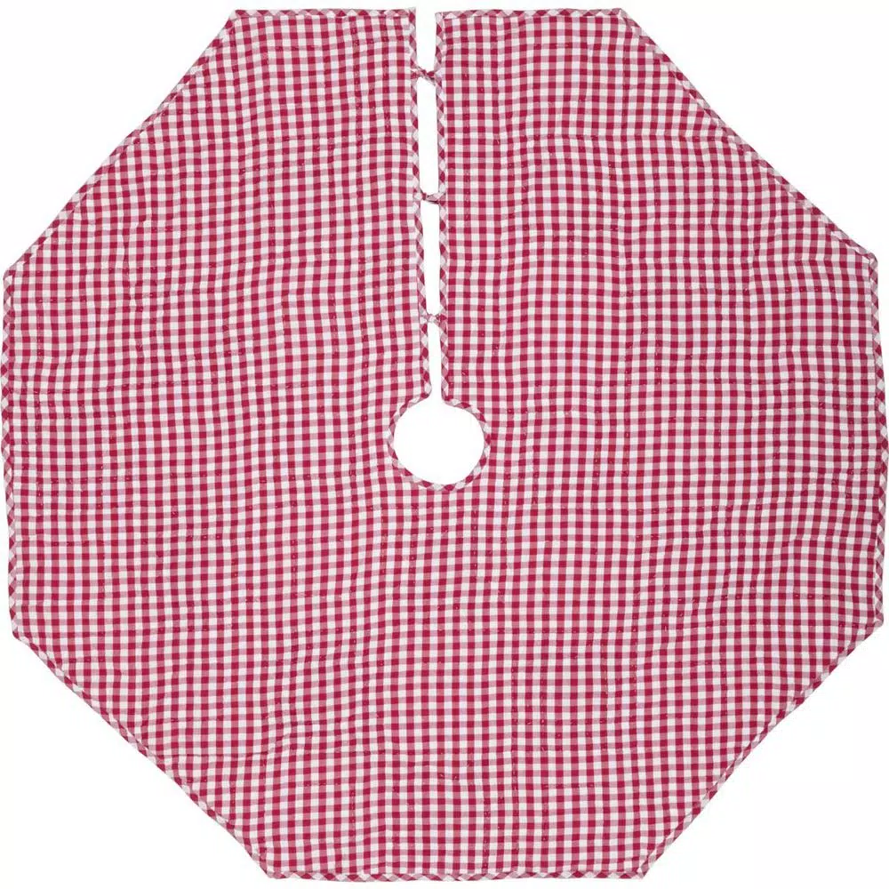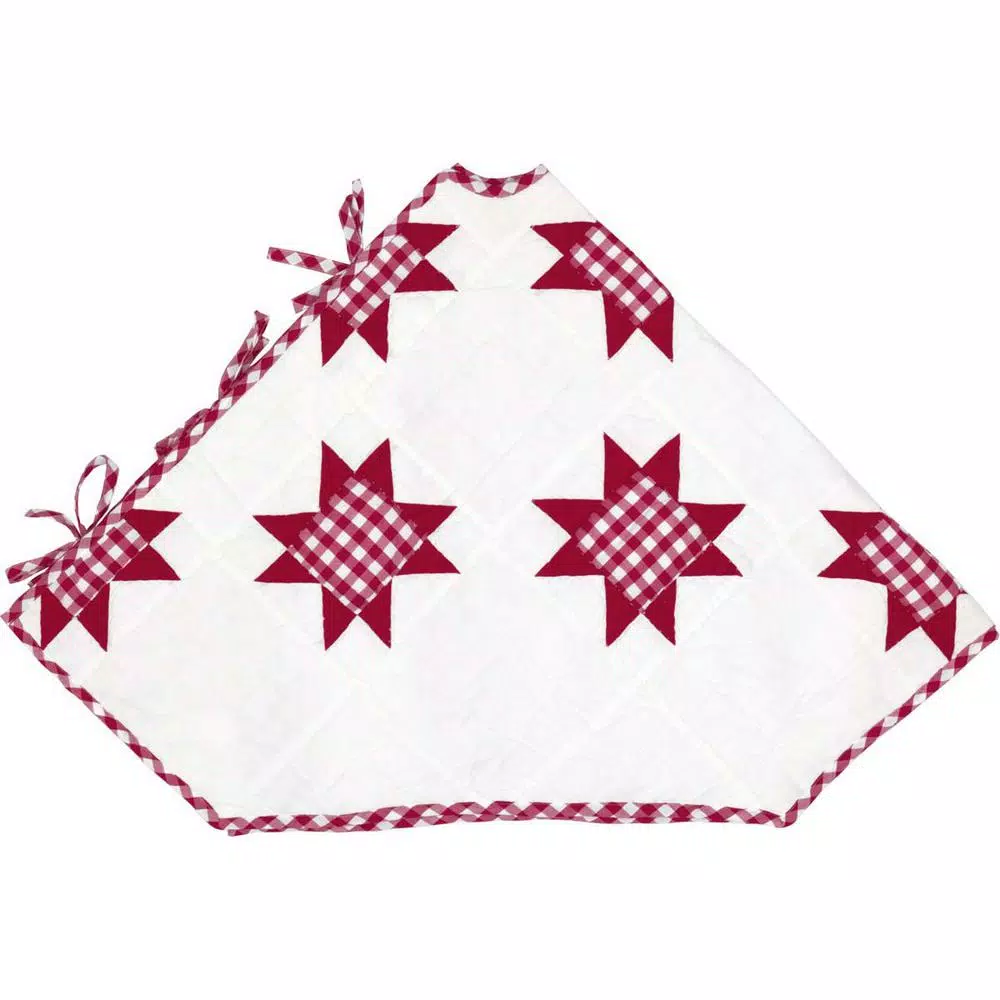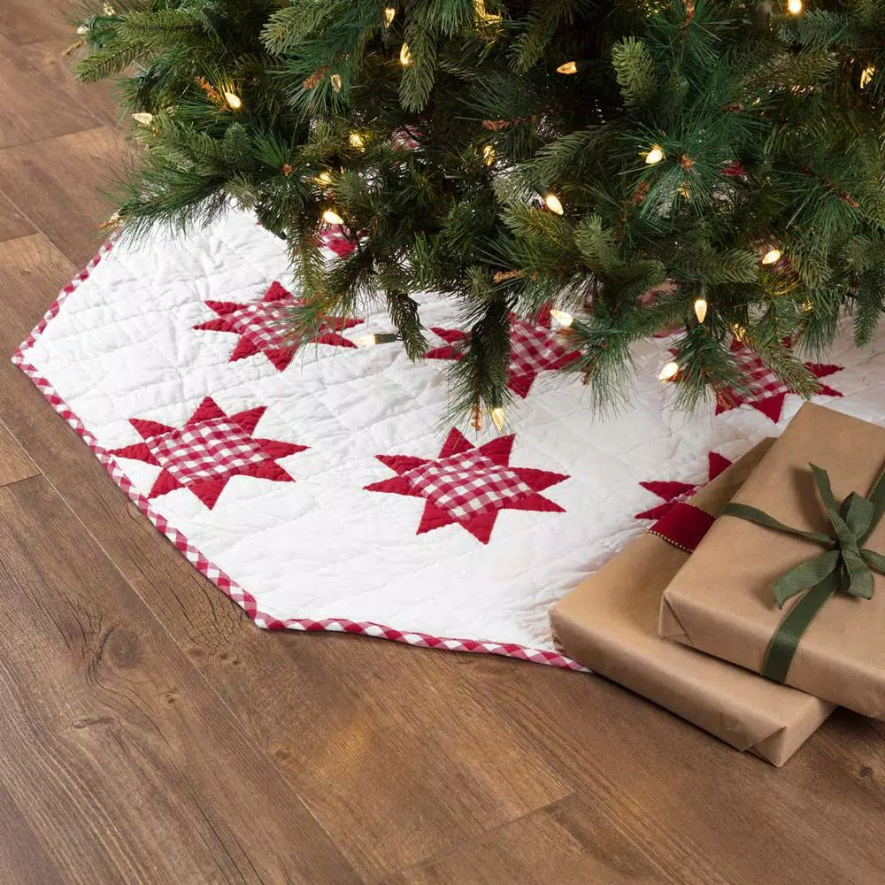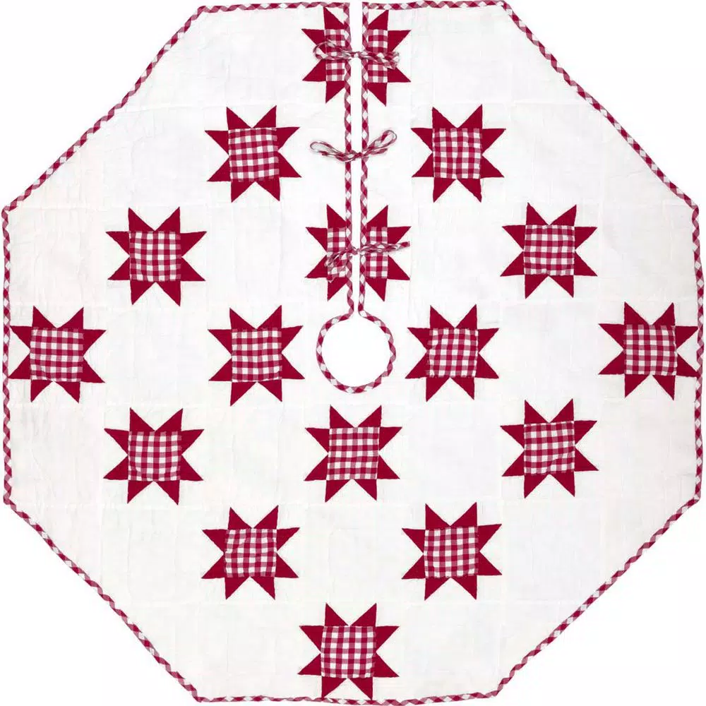 Countrify your Christmas this year with the Emmie Patchwork Tree Skirt. A holiday significant 7 rows of 8-point stars are placed on a bright white background. Reverses to the check found inside the stars. 100% cotton, hand-quilted.